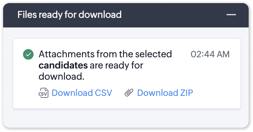 Mit dem neuen Update in Zoho Recruit können Sie Anhänge von ausgewählten Datensätzen direkt aus der Listenansicht eines Moduls herunterladen. Sie können bis zu 500 Datensätze auswählen und deren Anhänge in drei einfachen Schritten herunterladen: