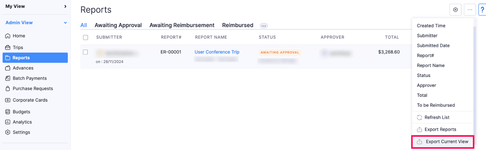 Du kannst die aktuelle Ansicht deiner Analytics-Berichte in den Modulen Trips, Reports und Advances exportieren. Filterungen oder Spaltenanpassungen bleiben erhalten, sodass genau diese Ansicht exportiert wird.