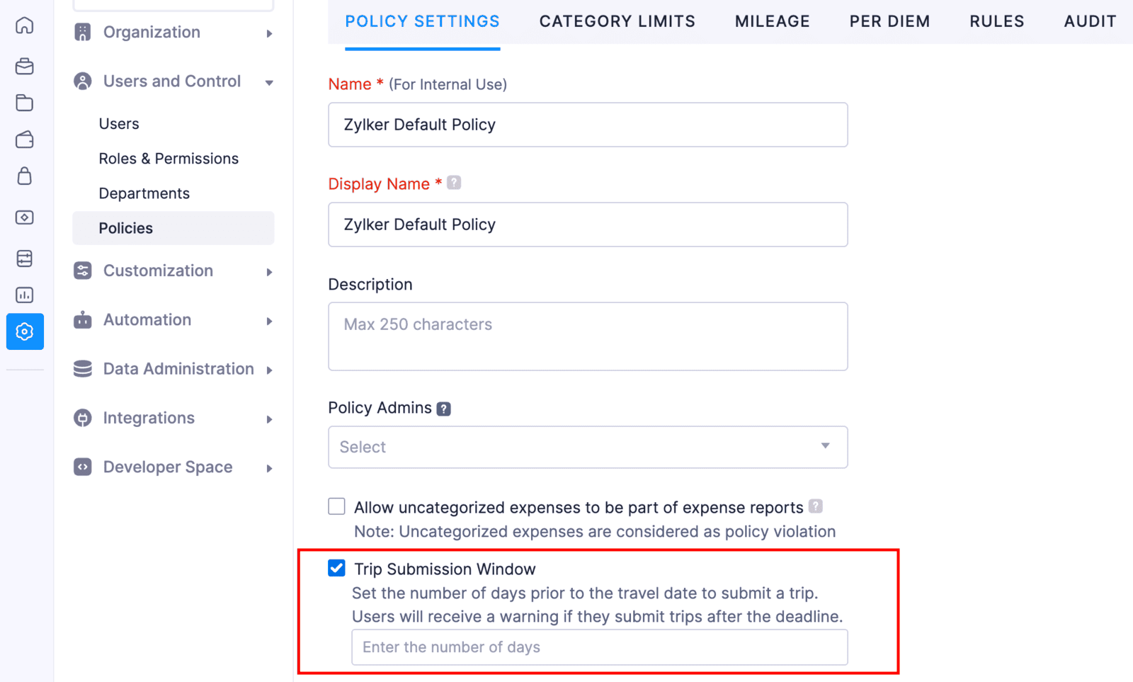 Du kannst jetzt ein Fenster für die Reiseeinreichung aktivieren und festlegen, wie viele Tage vor der Reise ein Trip eingereicht werden muss. Werden Reisen nach dem Stichtag eingereicht, erhalten die Mitarbeiter eine Warnung. - Umgang mit nicht gemeldeten Vorschüssen bei Stornierungen