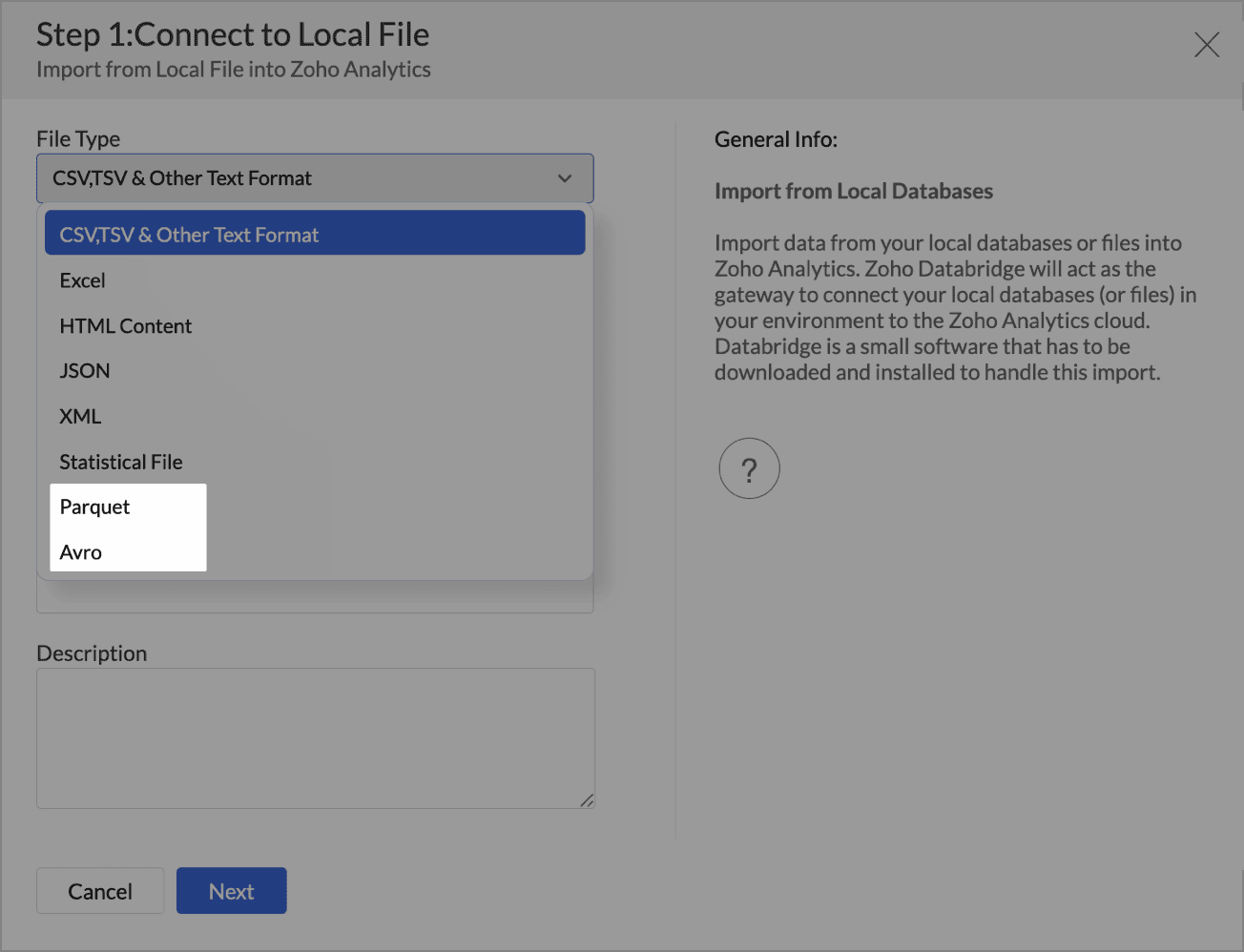 Der Umgang mit lokalen Dateien ist jetzt noch leistungsfähiger. Neben CSV-Dateien kannst du jetzt auch Parquet- und Avro-Dateien importieren, die besonders für Big Data geeignet sind. Außerdem kannst du große Dateien über 100 MB in Formaten wie Excel, HTML, JSON, XML oder Statistikdateien hochladen, ohne Einschränkungen.