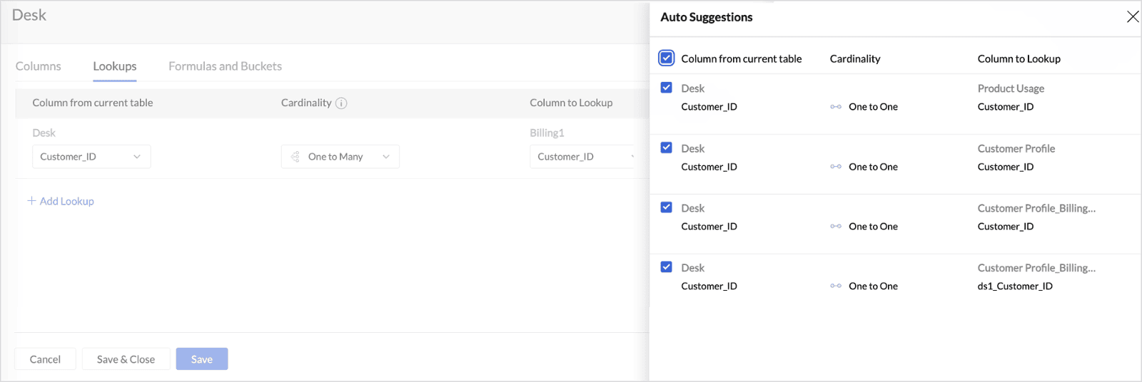 Das Erstellen von Beziehungen zwischen Tabellen wird einfacher. Zoho Analytics schlägt automatisch passende Verknüpfungen vor, basierend auf den Tabellendaten. Das spart Zeit, reduziert Fehler und vereinfacht die Datenmodellierung.