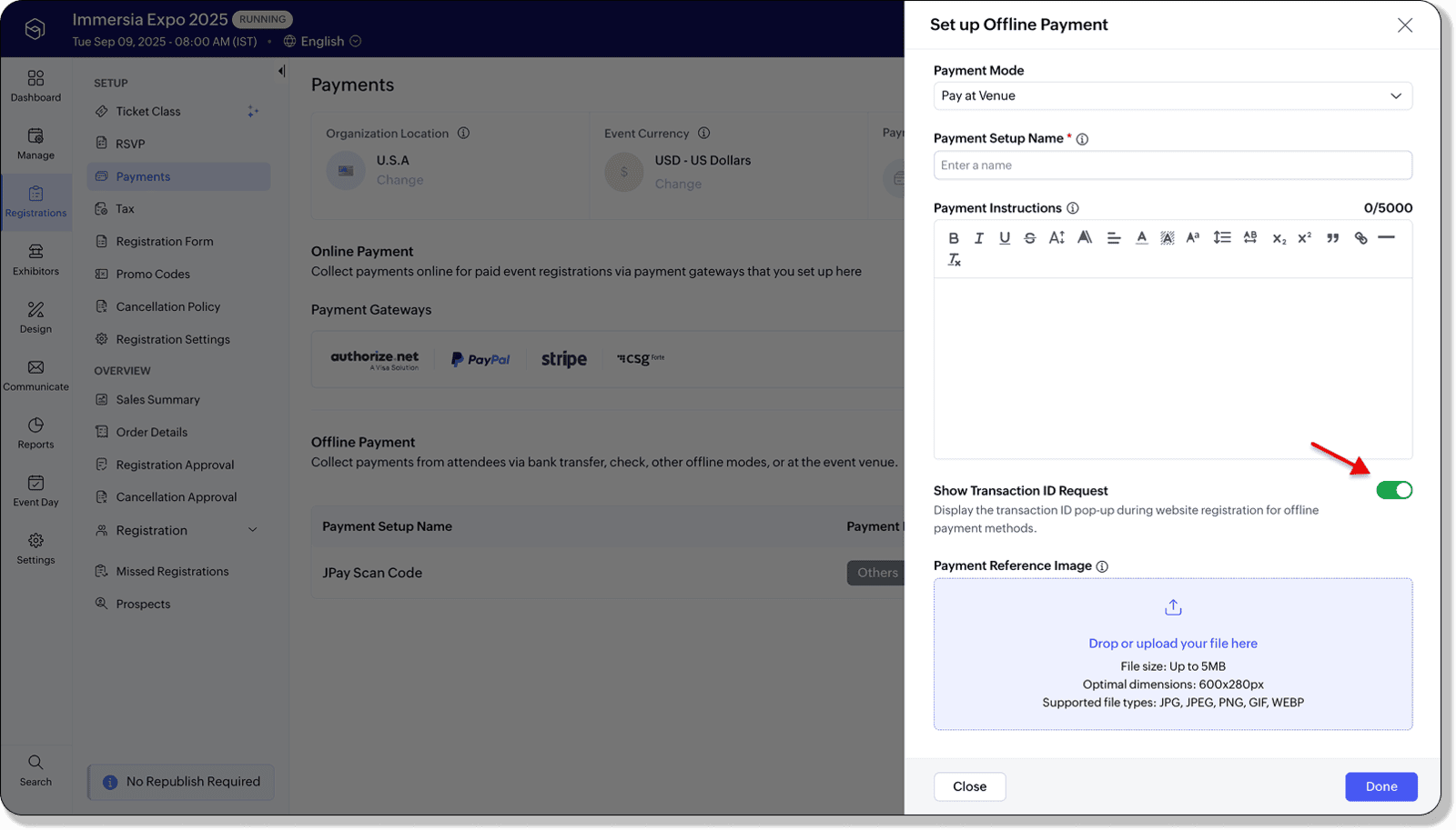 Bei Offline-Zahlungen können Organisatoren entscheiden, ob eine Transaktions-ID abgefragt werden soll. Dadurch entsteht mehr Flexibilität, und die Zahlungsabwicklung wird transparenter und nachvollziehbarer.