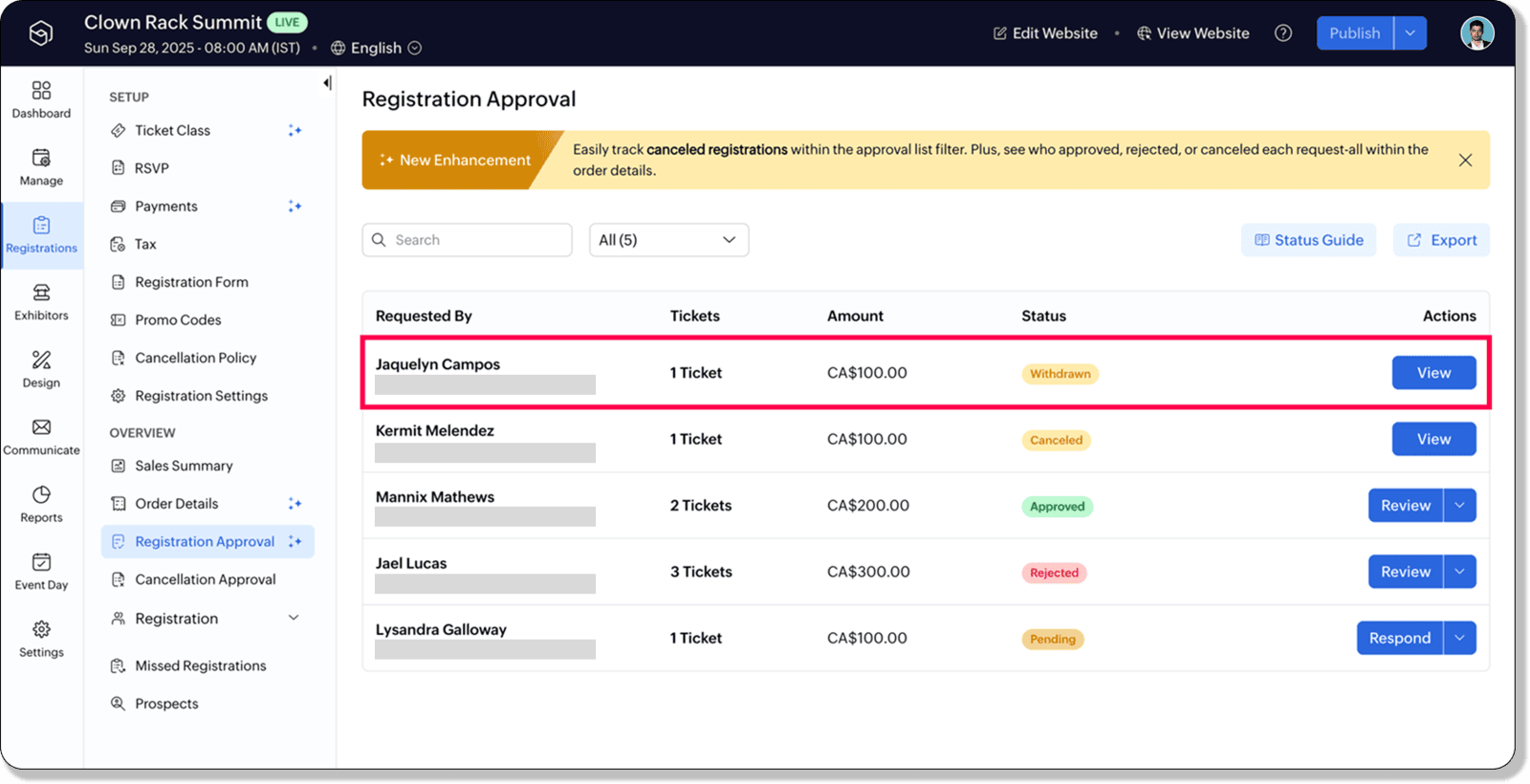 Teilnehmer können ihre Registrierung nun selbstständig zurückziehen. Für Organisatoren ist sofort sichtbar, ob es sich um eine freiwillige Abmeldung oder eine abgelehnte Anfrage handelt. Das sorgt für mehr Transparenz im gesamten Genehmigungsprozess. - Flexible Transaction-ID-Abfrage