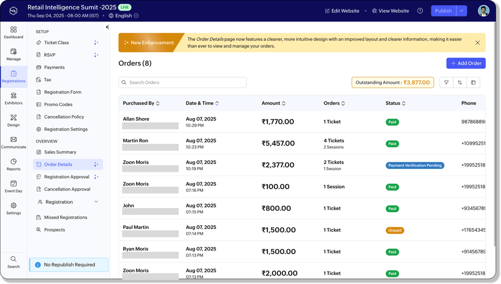 Für jedes benutzerdefinierte Formular kann ein verantwortlicher Ansprechpartner festgelegt werden. Antworten erreichen automatisch die richtige Person, wodurch Prozesse effizienter werden und klare Zuständigkeiten im Team bestehen. - Neues Order Management – Alle Bestellungen im BlickDie Bestellübersicht wurde komplett überarbeitet. Käuferinformationen und Bestellzusammenfassungen sind klar gegliedert, und Organisatoren haben direkten Zugriff auf Bearbeitungen, Rückerstattungen und Kommunikation. Erweiterte Filter- und Sortierfunktionen sorgen dafür, dass auch große Datenmengen übersichtlich bleiben.