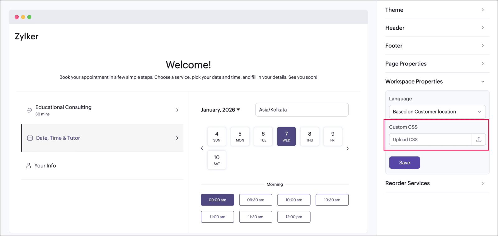 Zoho Bookings ermöglicht diese Individualisierung durch den Upload eigener CSS-Dateien direkt in den Workspace- oder Seiten-Einstellungen – aktuell verfügbar für Premium-Pläne und innerhalb des Basic-Themes.