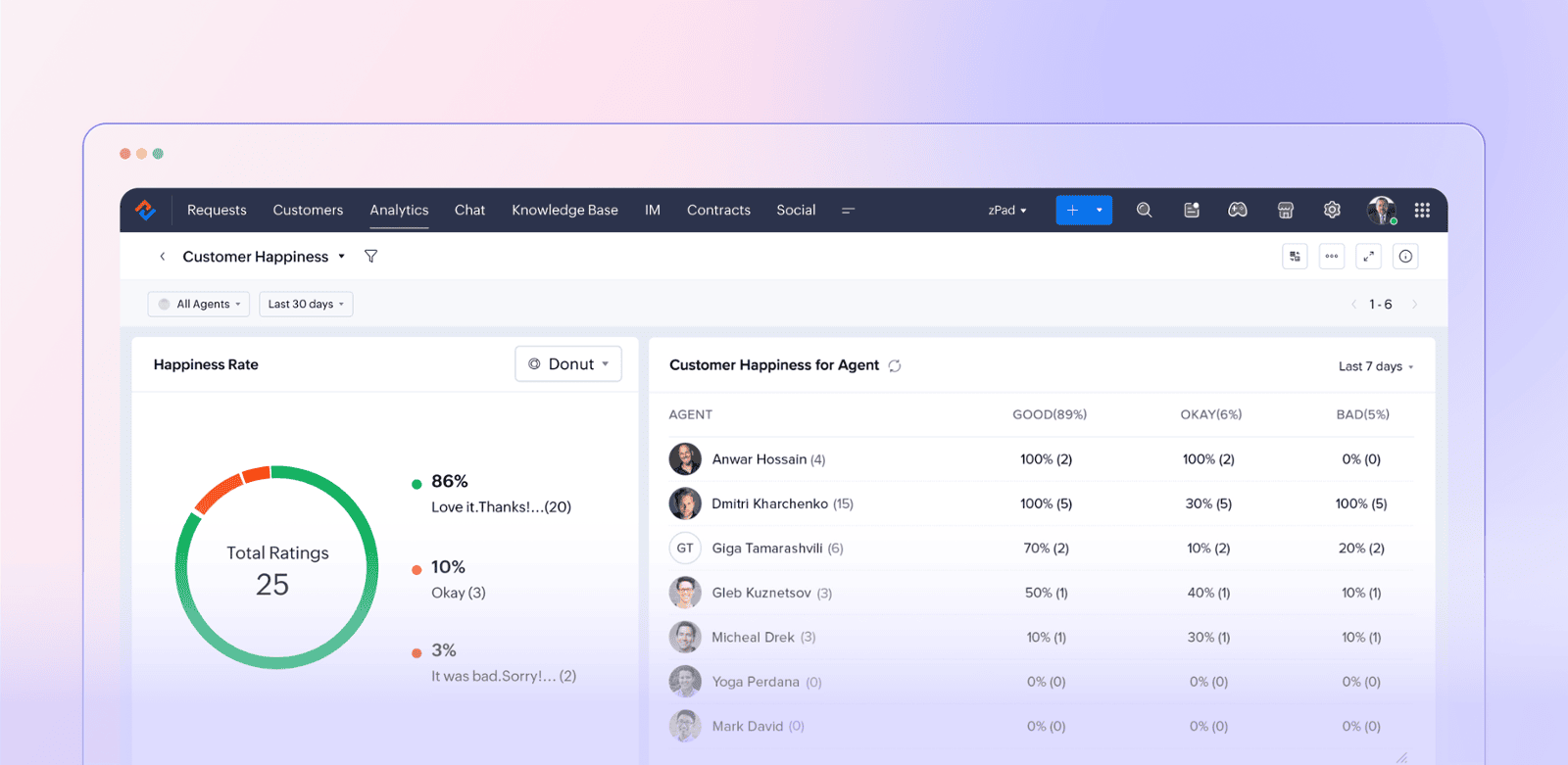 Zoho Desk unterstützt diesen Ansatz mit integrierten Zufriedenheitsabfragen, detaillierten Reports, Agenten-Vergleichen und kanalbezogenen Analysen – alles direkt im Helpdesk verfügbar.
