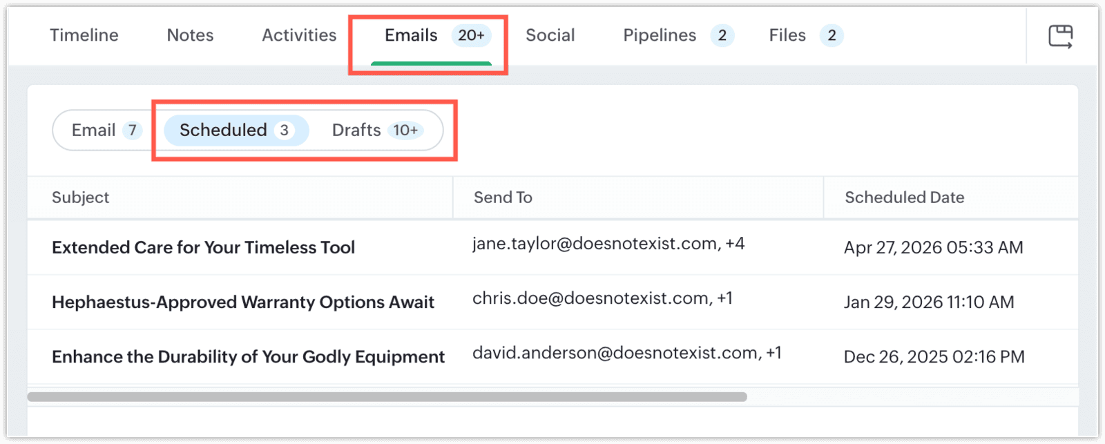 Alle gespeicherten und geplanten E-Mails sind direkt in der Kontakt- oder Pipeline-Ansicht sichtbar – so behalten Nutzer stets den Überblick über anstehende oder vorbereitete Nachrichten.