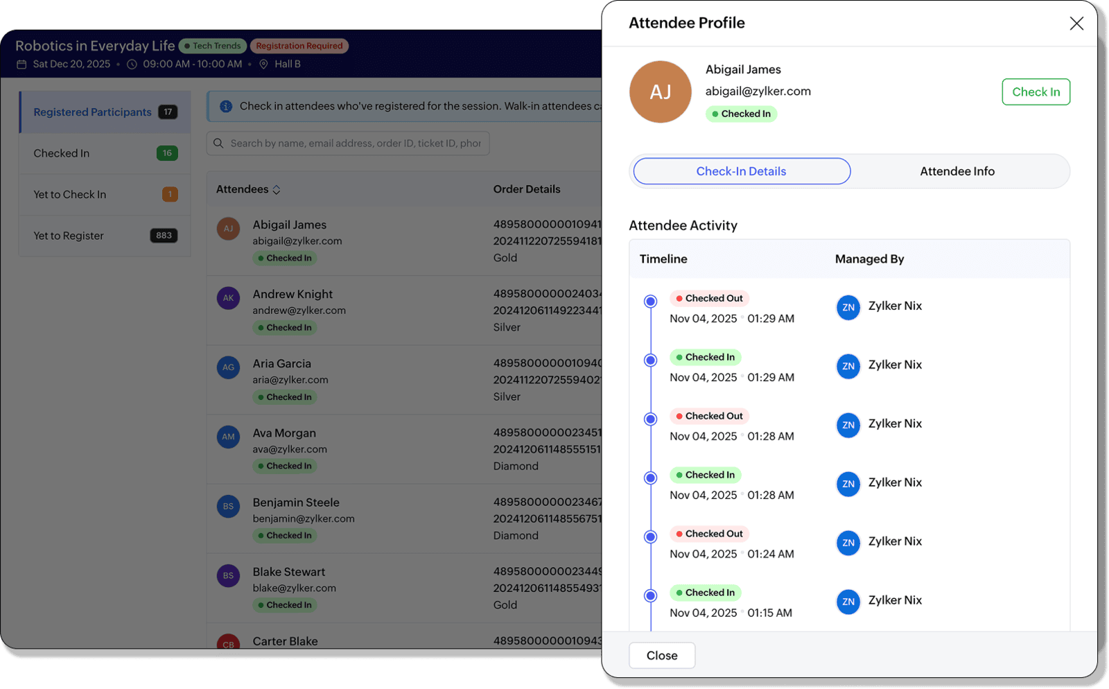 Mit den neuen Check-in- und Check-out-Protokollen können Veranstalter genau nachvollziehen, wann Teilnehmende eine Session betreten oder verlassen. Auch mehrfache Ein- und Ausgänge werden jetzt erfasst. Das sorgt für mehr Transparenz und ein besseres Verständnis der Teilnehmeraktivität.