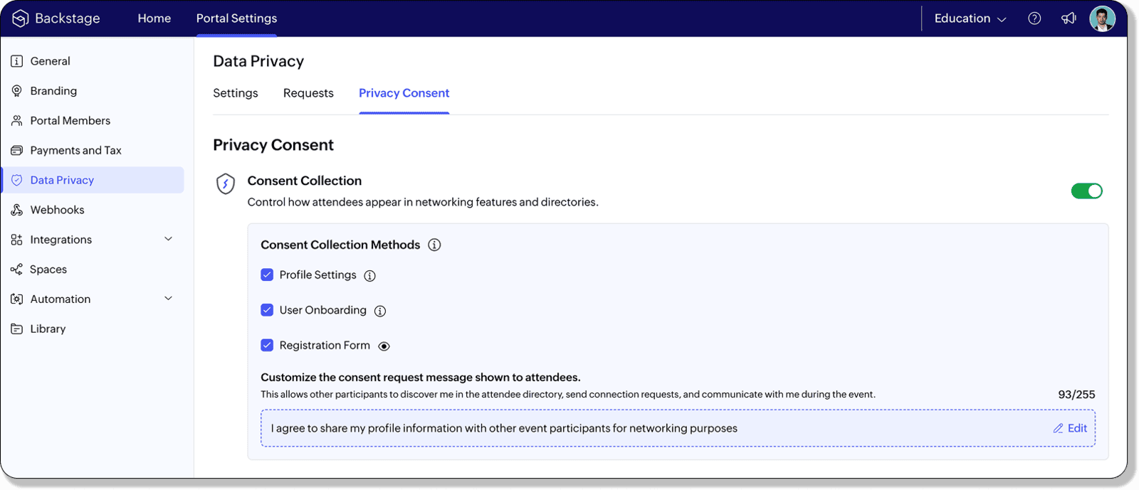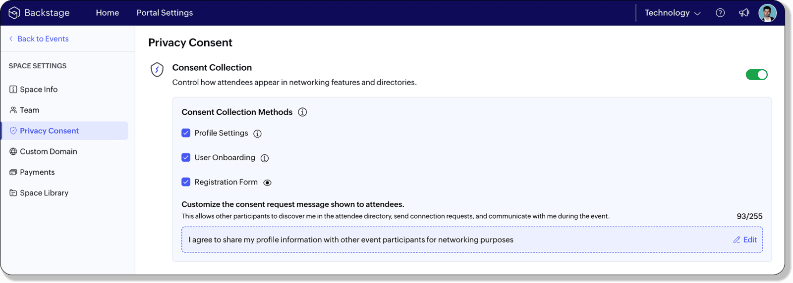 Organisatoren können Datenschutz- und Einwilligungseinstellungen flexibel anpassen – auf Portal-, Space- oder Event-Ebene. So lässt sich genau steuern, wann und wo Teilnehmende ihre Zustimmung zur Datennutzung geben, etwa bei der Registrierung oder im Profil.