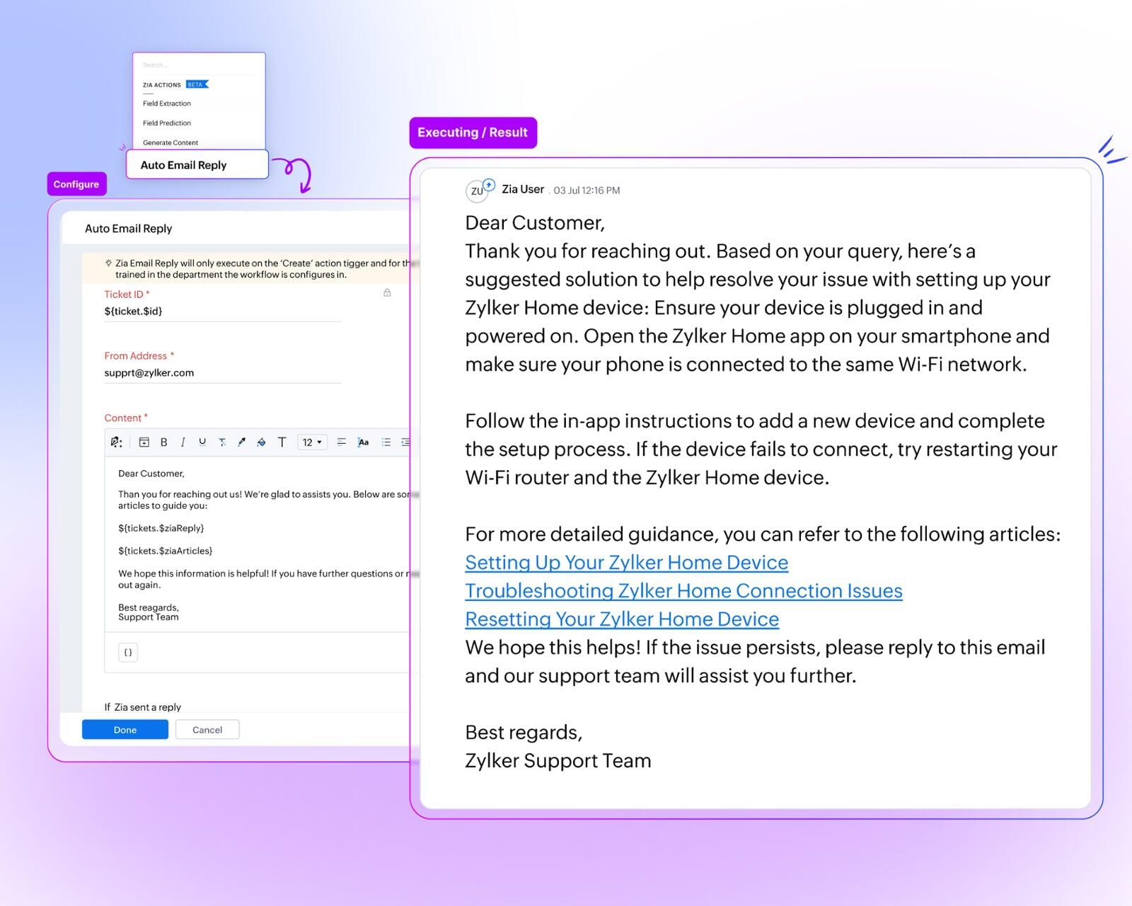 Zia erstellt passende E-Mail-Antworten inklusive Links zu relevanten Knowledge-Base-Artikeln. So lassen sich häufige Anfragen automatisch beantworten – und das Support-Team wird entlastet.