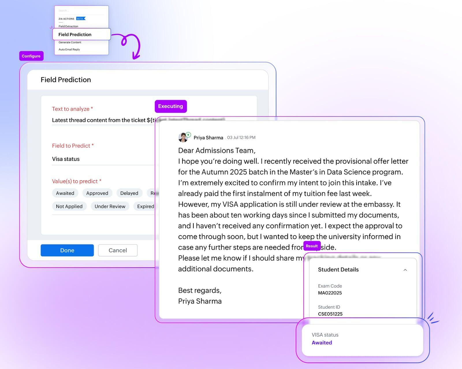Die KI kann anhand von Ticketinhalten Feldwerte vorhersagen, etwa den Bearbeitungsstatus oder den Dringlichkeitsgrad eines Falls. Das spart Zeit und verbessert die Priorisierung von Aufgaben.