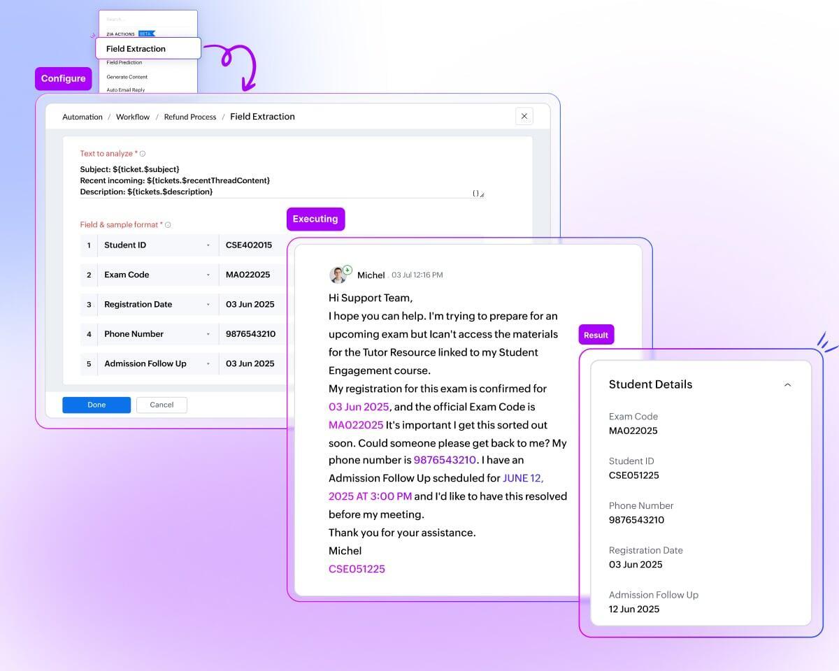 Zia analysiert eingehende Tickets und extrahiert automatisch relevante Informationen wie E-Mail-Adressen, Telefonnummern, Produktcodes oder Bestellnummern. So werden Felder direkt ausgefüllt und manuelle Fehler vermieden.